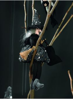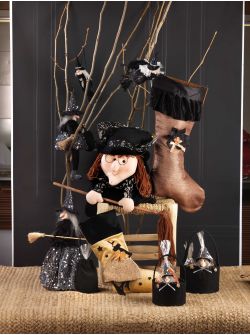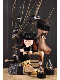 Befana in Piedi in Tessuto Grigio/Nero con Paillettes e Sacco