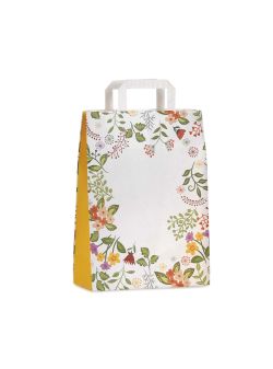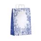 Shopper in carta decorata dal carattere raffinato con elegante decoro grafico blu su fondo bianco, che rende questa particolare borsa in carta sempre attuale. Il soffietto colorato ne rafforza lo stile e la maniglia in carta bianca la rende una busta comoda, resistente e ideale per contenere articoli di vario genere. Bellissima da personalizzare e valorizzare con il tuo logo.